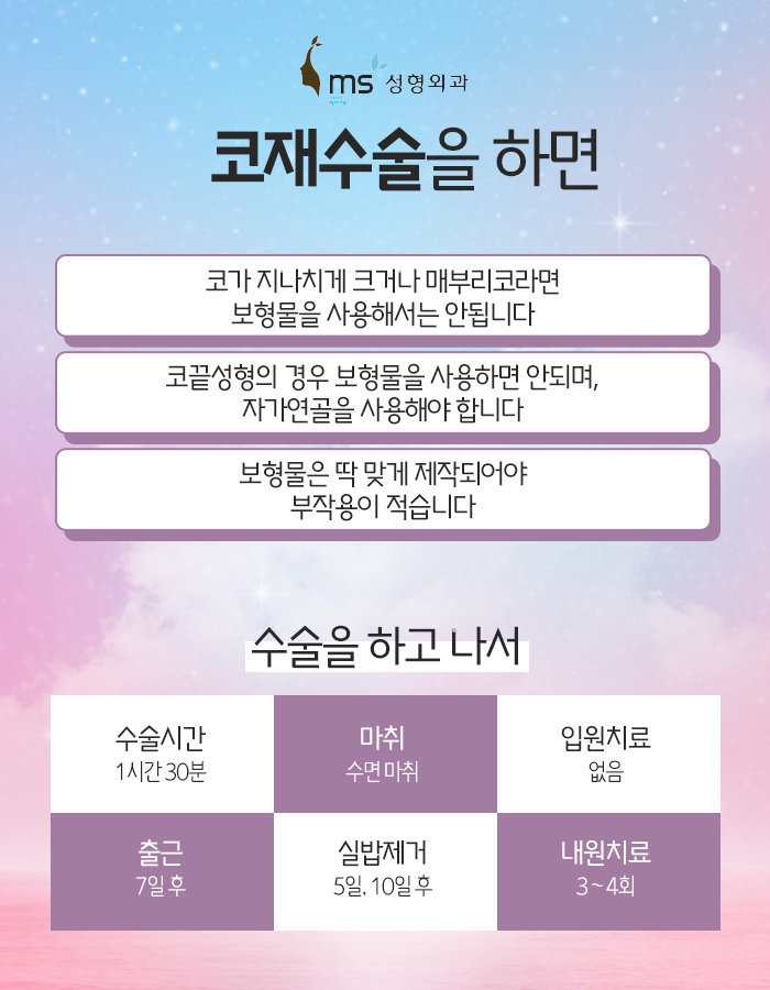그리고 다른 곳에서 남자매부리코 성형을 했는데 매부리가 제대로 개선되지 않았거나 코끝수술을 할 때 연골이식이 아닌 보형물을 사용해서 코재수술을 받기 위해 찾아주시는 경우도 있는데요. 이런 경우 수술을 받는데 1시간 30분이 걸리며, 마취는 수면 마취로 진행하게 된답니다. 또 일상생활은 7일 후부터 가능하고 실밥은 5, 10일 후에 제거가 가능한데요. 내원치료는 3~4회 받으셔야 한답니다.